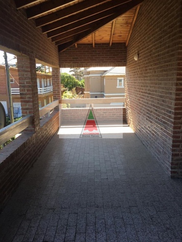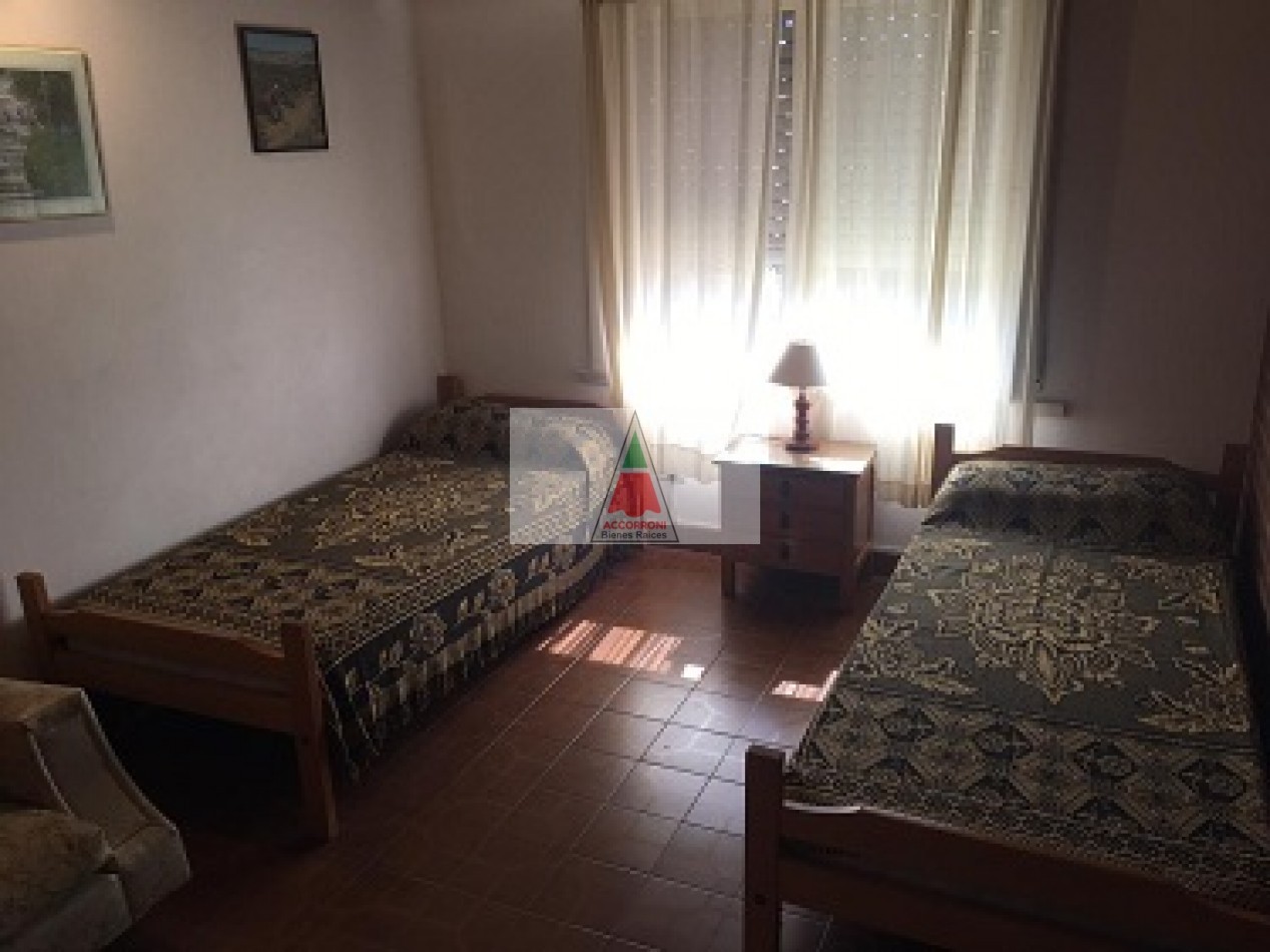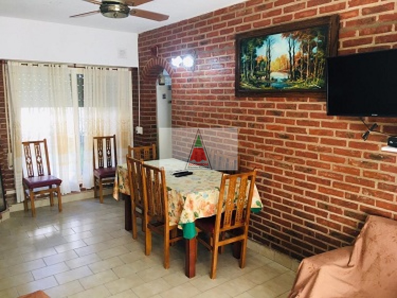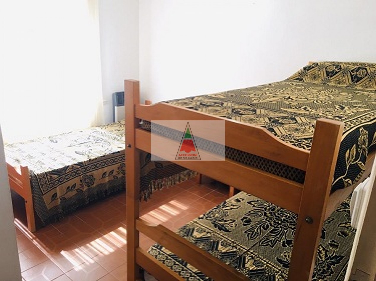 Amplio chalet totalmente equipado distribuido en dos plantas, patio cercado con parrilla y estacionamiento semicubierto. En planta baja un amplio living comedor con sillón y SmarTv, cocina totalmente equipada, dormitorio con cama cucheta y cama simple mas baño completo. En planta alta un dormitorio matrimonial, baño completo y otro dormitorio con 2 camas simples mas salida a amplia terraza. Servicio de wifi y Tv por DirecTv, excelente ubicación a metros del balneario ``La Serena´´, capacidad 7 personas.