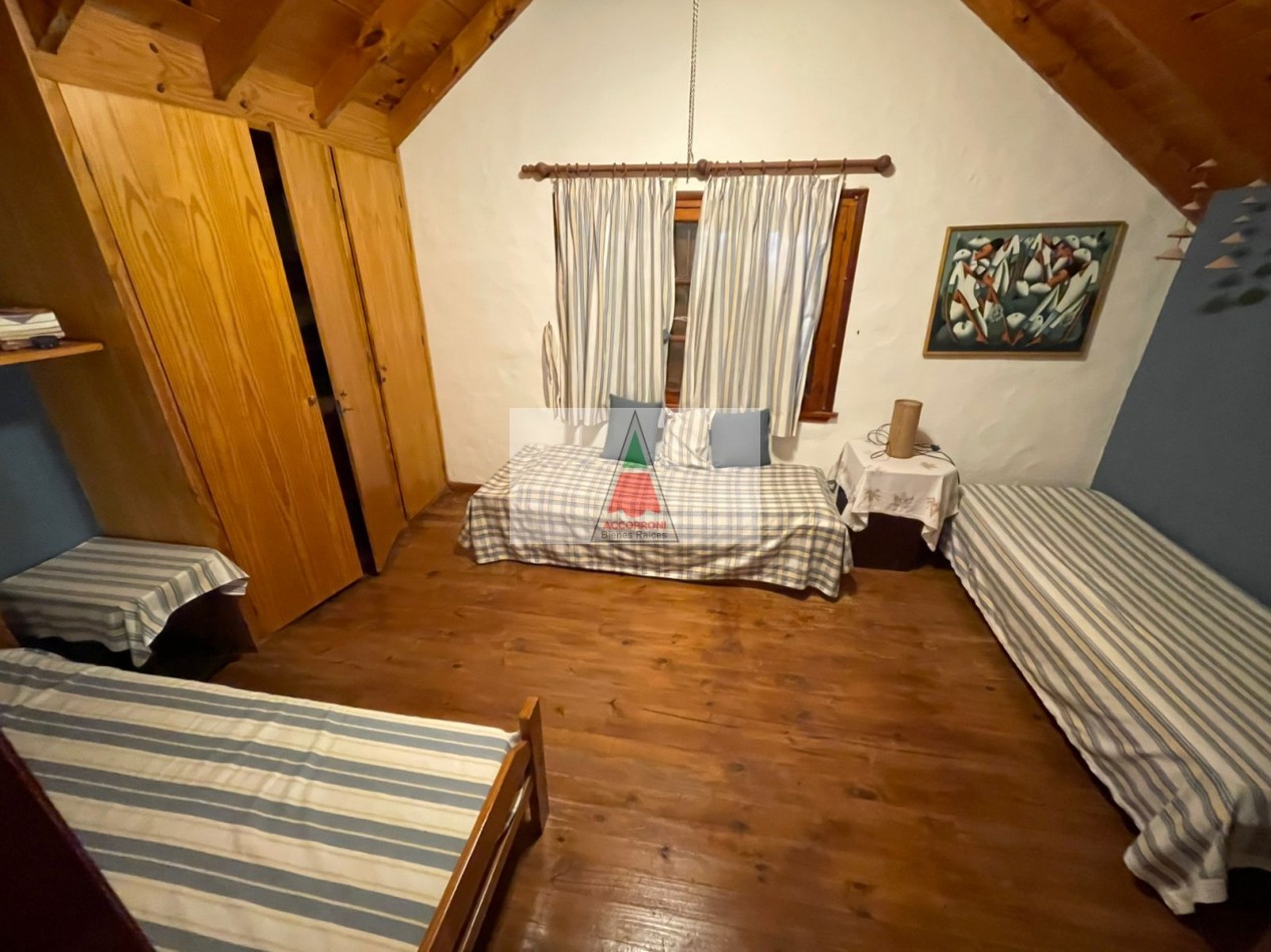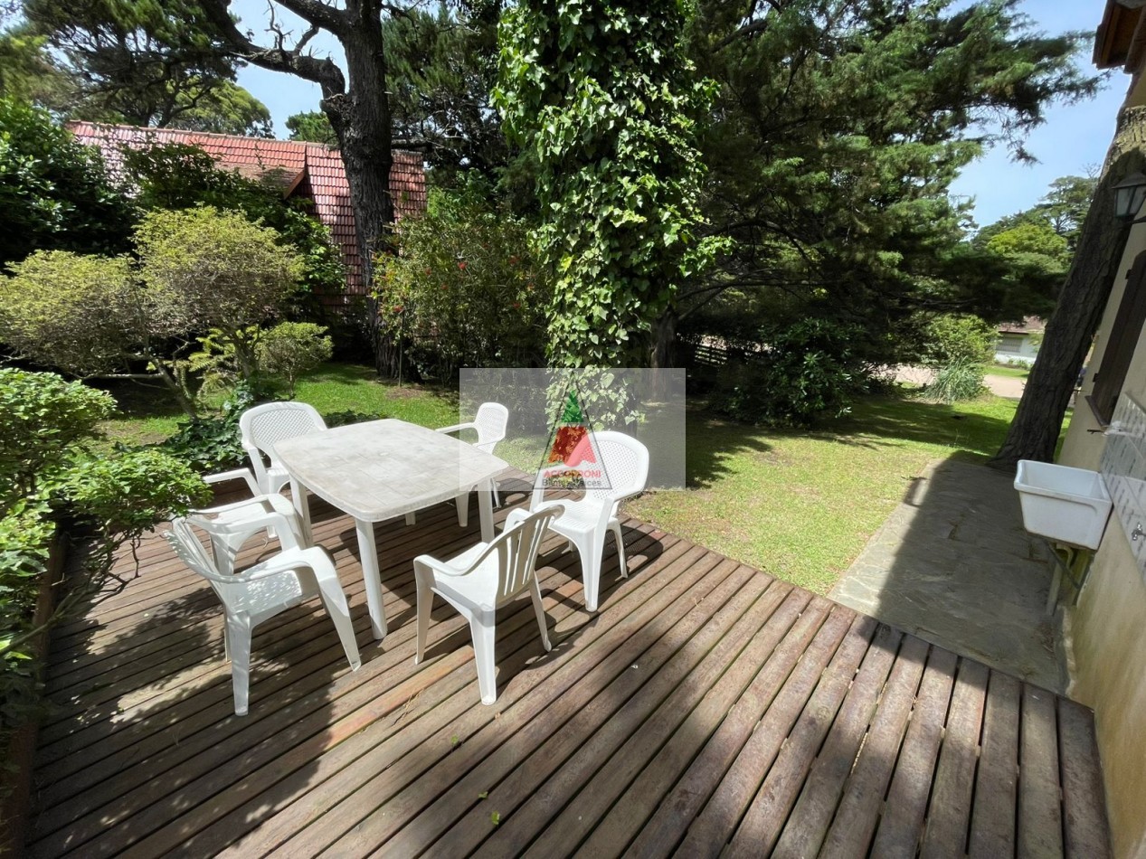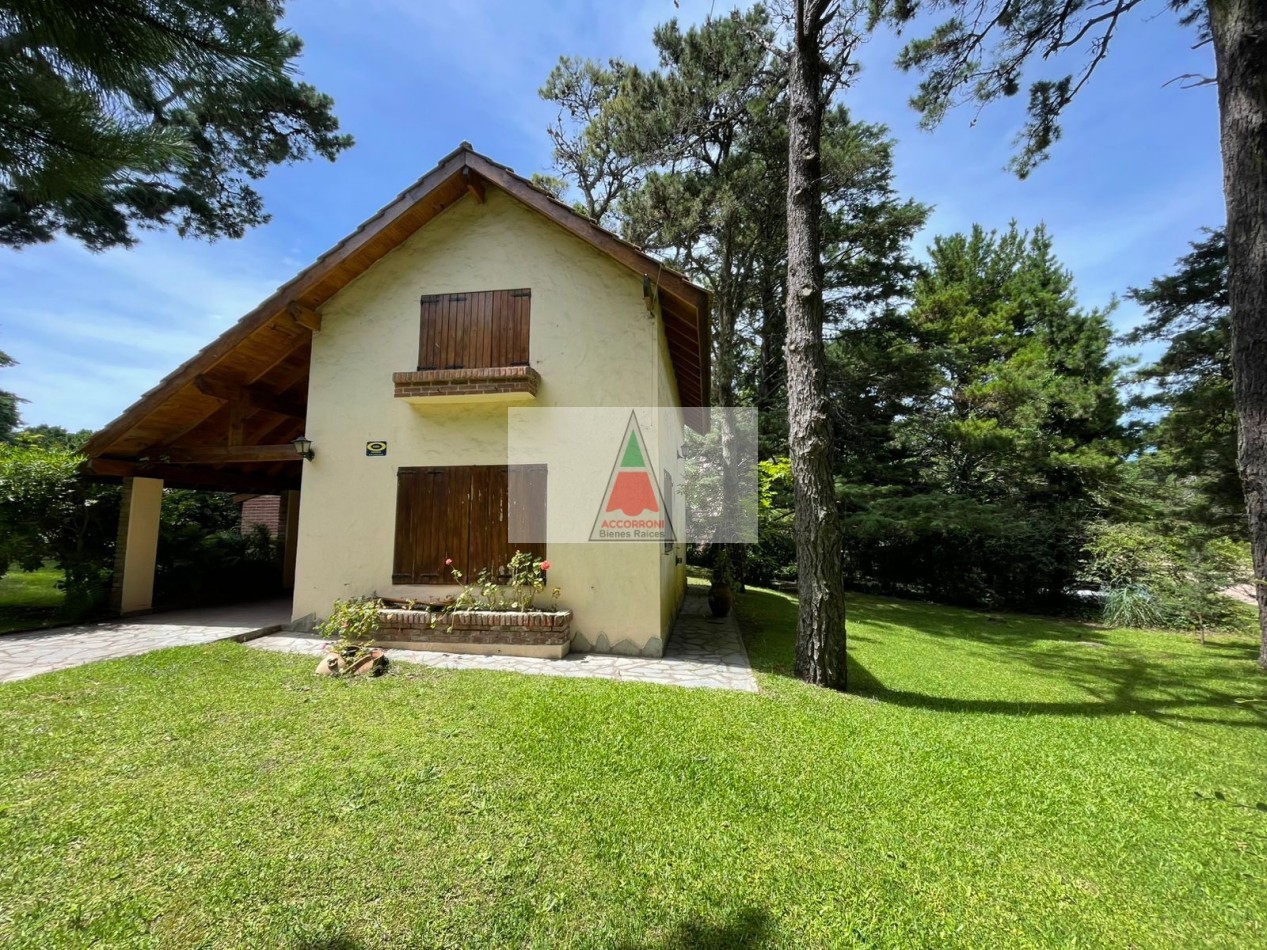 Agradable Chalet de 3 ambientes distribuido en dos plantas, ubicado en la zona del Pinar de Valeria del Mar, cuenta con un amplio parque, deck y quincho semicubierto con parrilla, mas estacionamiento semicubierto. Al ingreso amplio living comedor con cocina semi integrada mas un baño. En primer piso una habitación matrimonial, habitación con 3 camas simples, baño.