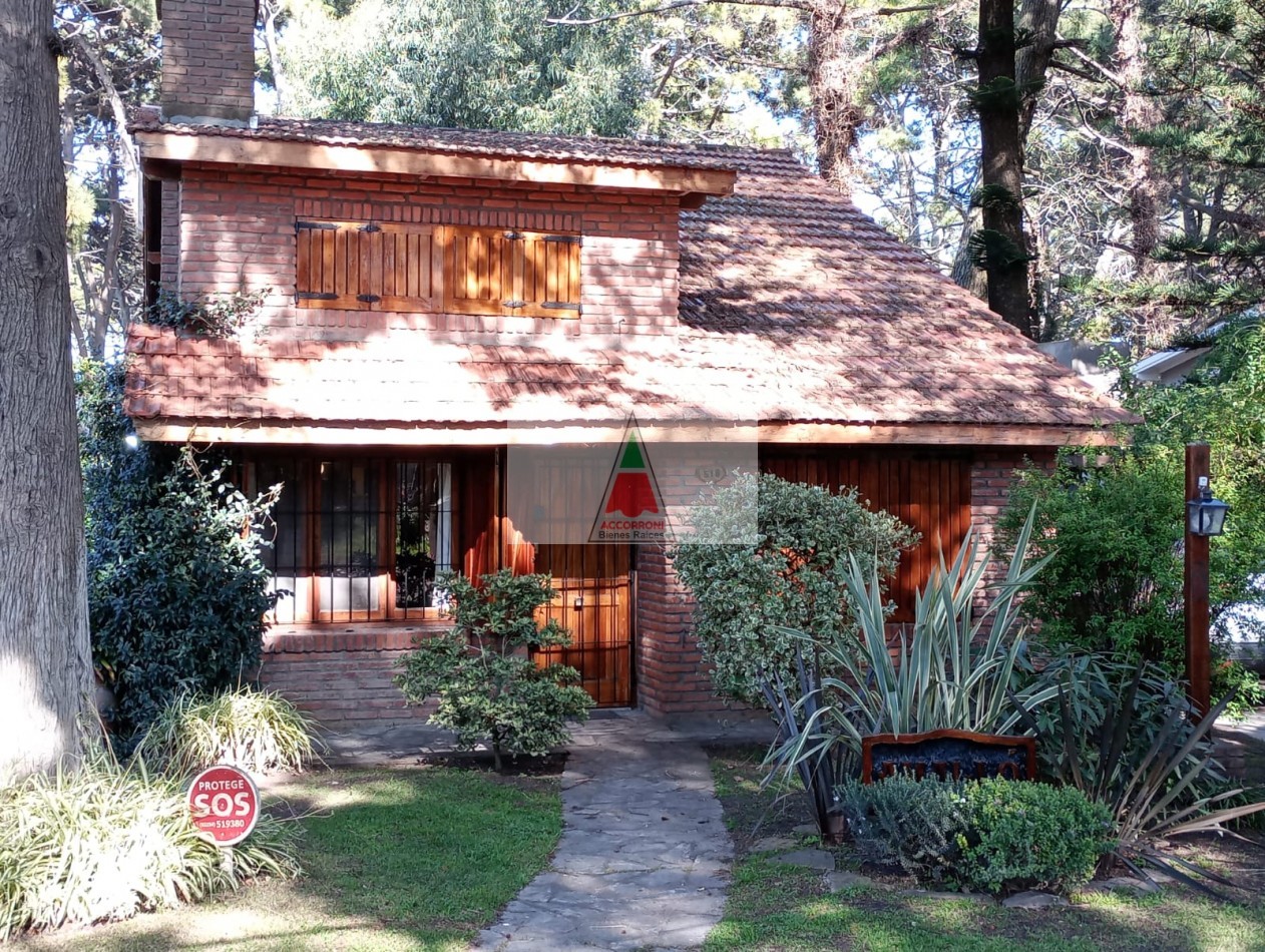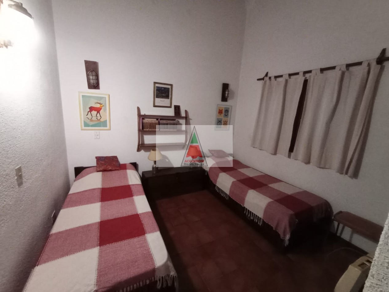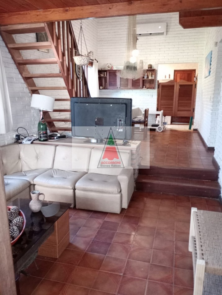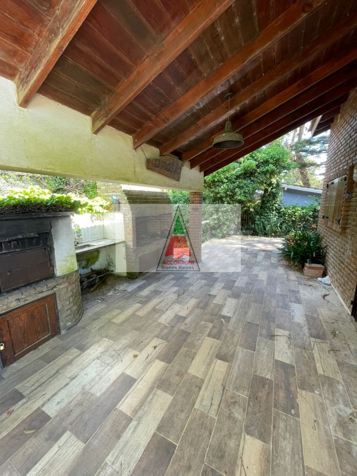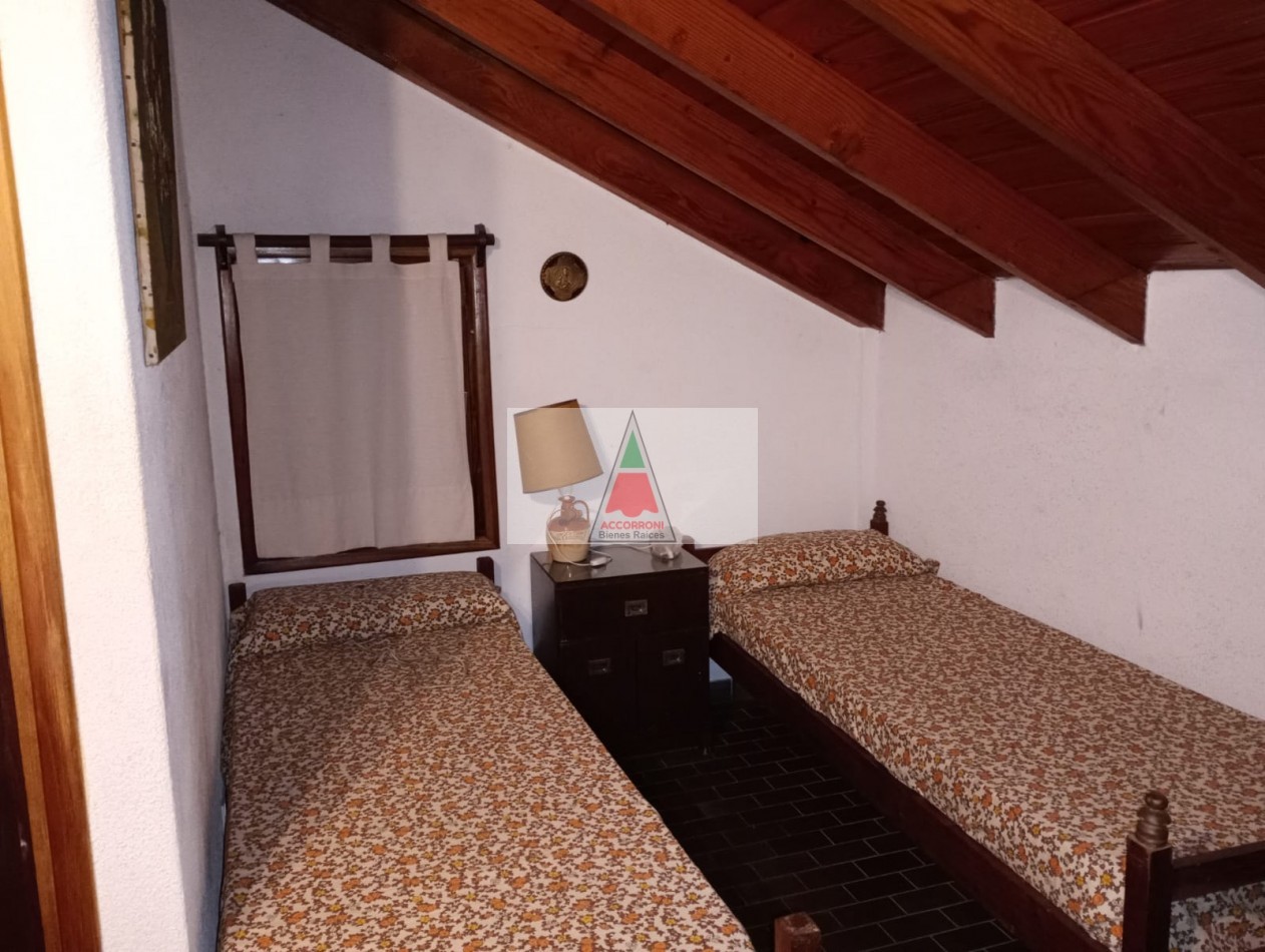 Agradable y espacioso chalet ubicado a 2 cuadras del mar y 3 del centro de Valeria del Mar. Distribuido en dos plantas cuenta con un amplio parque con arboles de la zona, quincho semicubierto con parrilla y espacio guarda coche semi-cubierto. En planta baja al ingresar nos encontramos con un amplio living con sillones y tv, comedor y cocina. Un dormitorio con 2 camas simples, un baño completo, dormitorio matrimonial y otro baño completo (Ambos nuevos). En planta alta un dormitorio con 2 camas simples mas baño. Servicio de alarma, wifi y tv. Capacidad 6 personas.