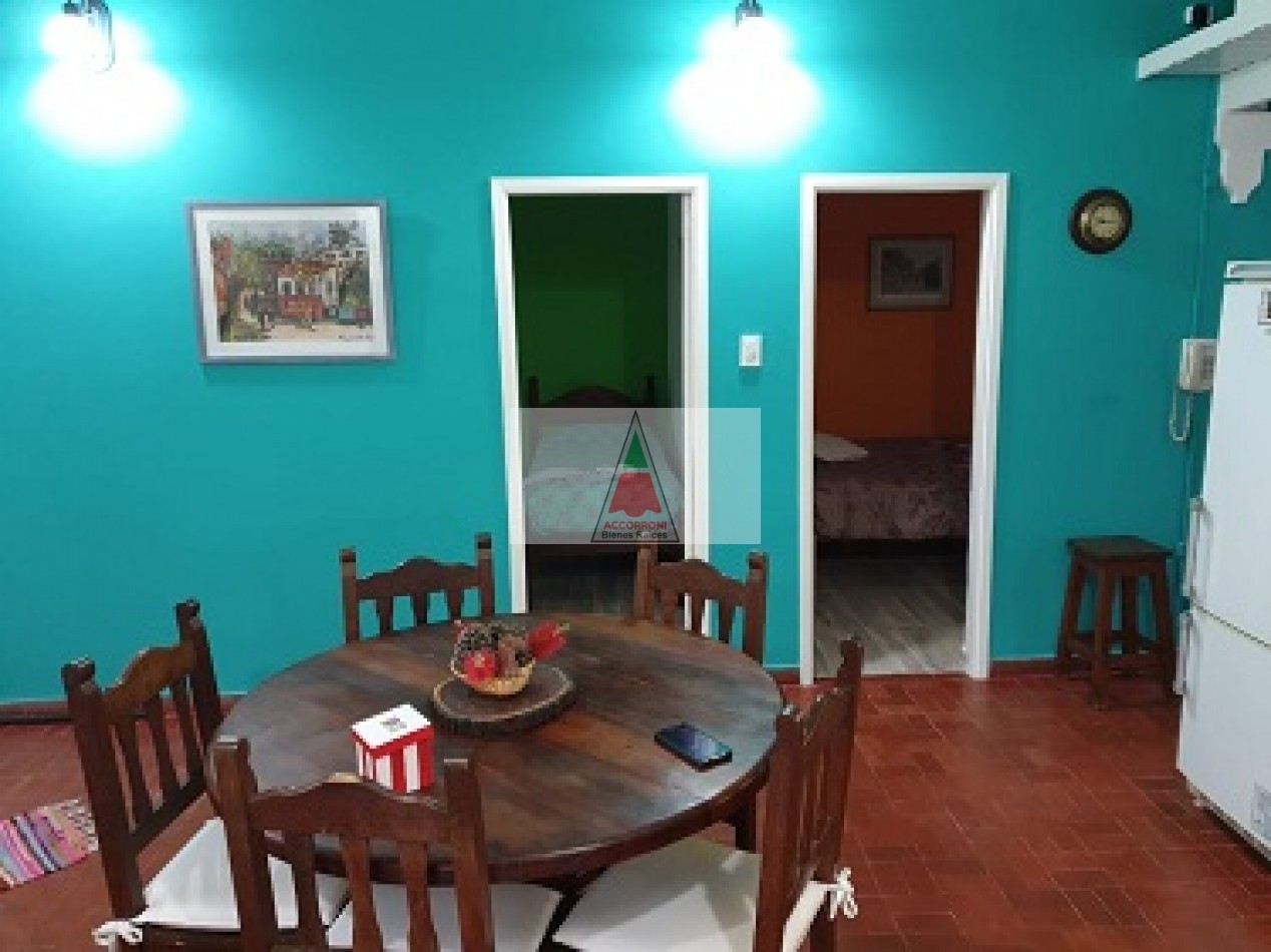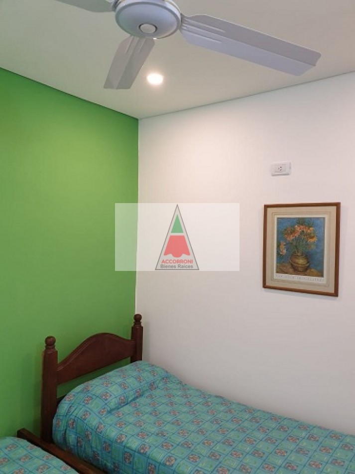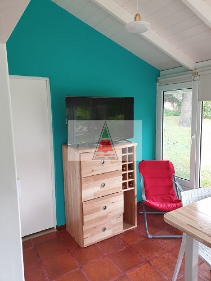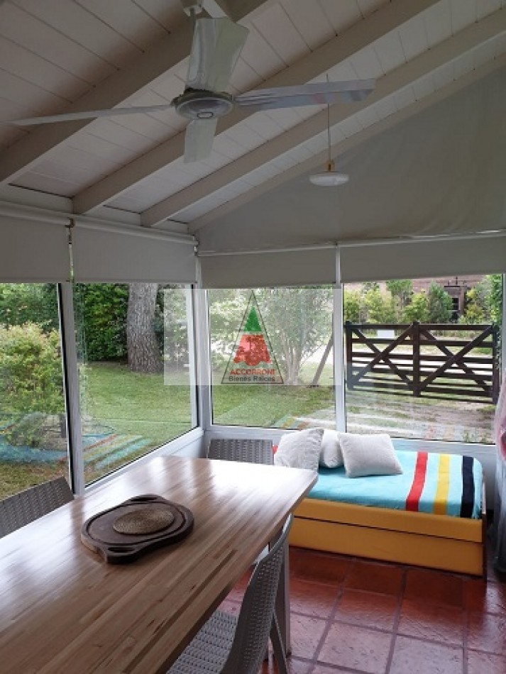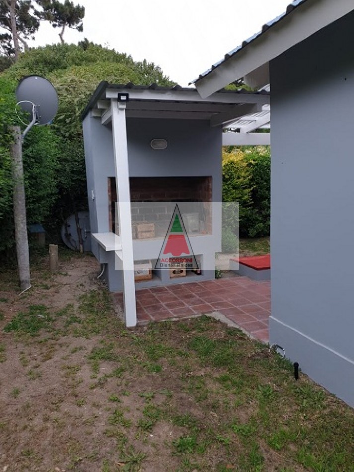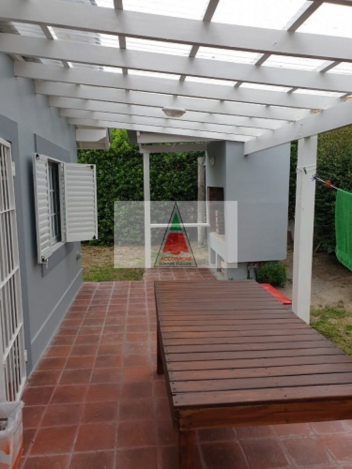 Excelente chalet en estratégica zona a 2 cuadras del mar y 7 del centro de Valeria del Mar. Cuenta con un amplio parque con estacionamiento mas quincho (Ambos semi-cubiertos). Al ingresar encontramos un amplio comedor con cocina integrada, amplio living con sofá cama y tv, dos baños completos, dormitorio con dos camas simples y dormitorio matrimonial. Aire acondicionado en dormitorio matrimonial y living, lavarropas, servicio de wifi, alarma y tv por DirecTv.