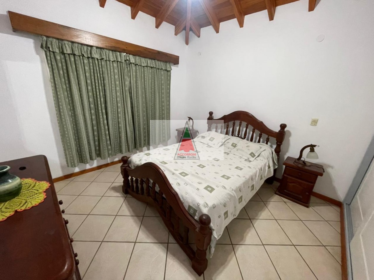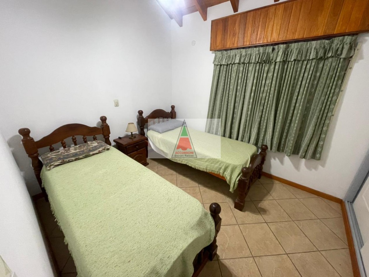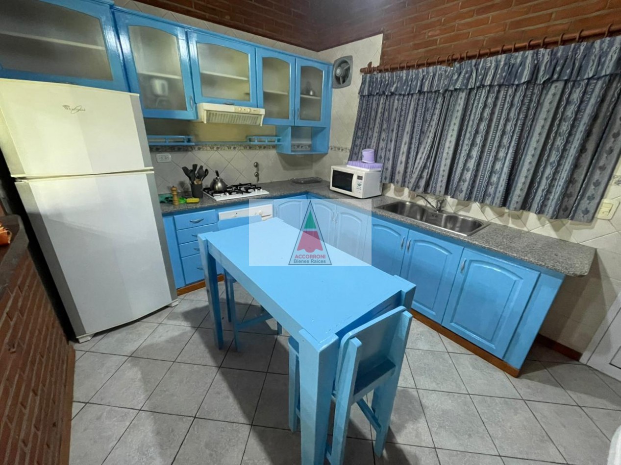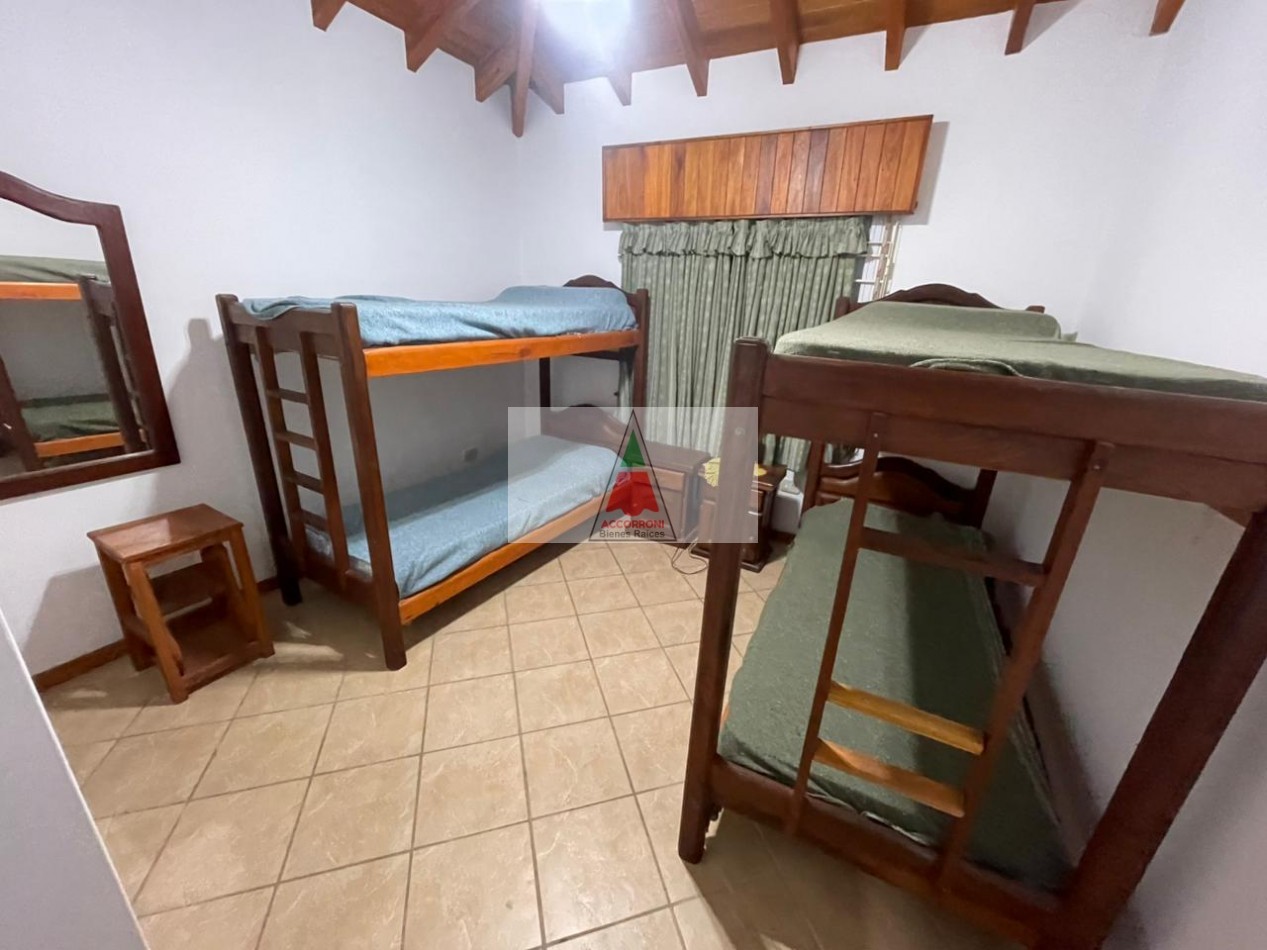 Excelente y amplio chalet en privilegiada ubicación, al ingreso nos encontramos con un gran y luminoso living comedor separada por una barra nos encontramos la cocina totalmente equipada y un ventanal con salida a un patio semi cubierto, parrilla y un muy amplio y pintoresco parque. En la parte interior cuenta con un dormitorio matrimonial, un baño completo, un dormitorio con 2 camas simples, un dormitorio con 2 camas cuchetas y otro baño completo. Estacionamiento semicubierto, ubicada a menos de media cuadra del mar y cinco cuadras y media del centro de Valeria del mar. Servicio de alarma, wifi y tv, capacidad de 8 personas.